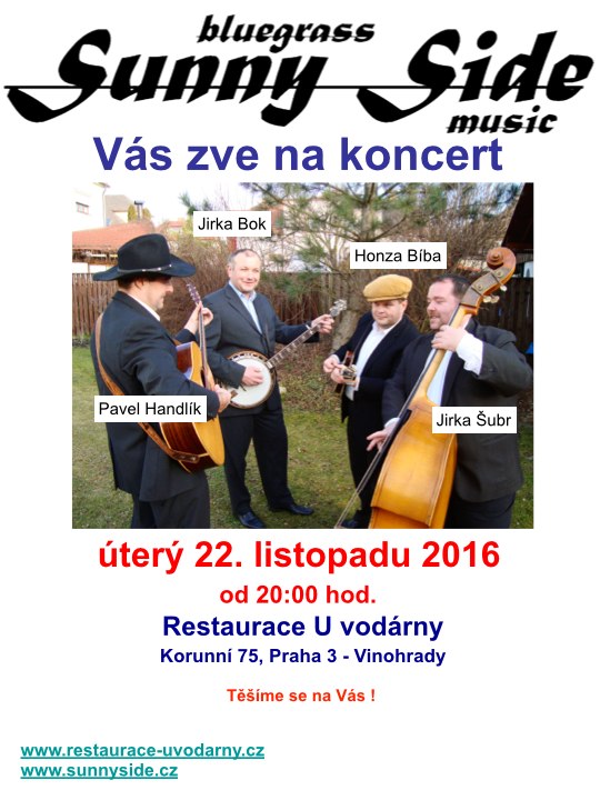 Vážení přátelé a příznivci dobré muziky, dovolujeme si Vás co nejsrdečněji pozvat na hudební večer s kapelou Sunny Side a to v úterý 22. listopadu 2016 od 20.00 hodin do restaurace U Vodárny, Korunní 75, Praha 3 – Vinohrady. Opět Vás čeká velká porce skvělého bluegrassu a super zábavy v podání sestavy Handlík, Bok, Bíba, Šubr.