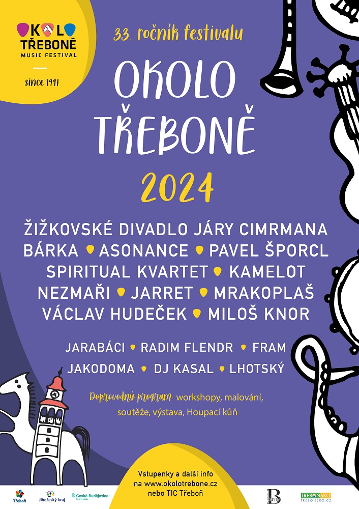 Kompletní program Okolo Třeboně na rok 2024 najdete zde. Kromě Žižkovského divadla a Bárky se můžete těšit na Nezmary, Asonanci, Václava Hudečka, Pavla Šporcla, Mrakoplaš, Spolektiv, Jarret, Miloše Knora a spoustu dalších jmen. Předkapely budeme do programu doplňovat postupně.