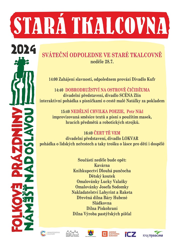 Ve Staré tkalcovně a jejím bezprostředním okolí proběhne tradiční Sváteční odpoledne u Staré tkalcovny s divadly a dílnami. Prostor Staré tkalcovny se otevře v neděli 28. 7. od 14 hod. Celým nabitým odpoledním programem, určeným nejen rodinám s dětmi, provede Divadlo KUFR. Můžete se těšit na interaktivní pohádku s písničkami pro děti i dospělé DOBRODRUŽSTVÍ NA OSTROVĚ ČIČIDŽUMA divadla SCÉNA Zlín. Po něm bude následovat improvizovaná směsice textů a písní Petra Nikla s názvem NEDĚLNÍ CHVILKA POEZIE. Divadlo LOKVAR přijede s pohádkou