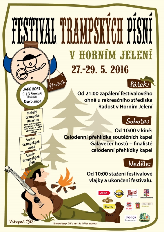 Ahoj kamarádi, příznivci trampské písně, zveme Vás na 41. ročník Festivalu trampských písní – akce, která má dlouholetou tradici a koná se vždy poslední květnový víkend v Horním Jelení na Pardubicku (letos tedy 27. - 29. května 2016).