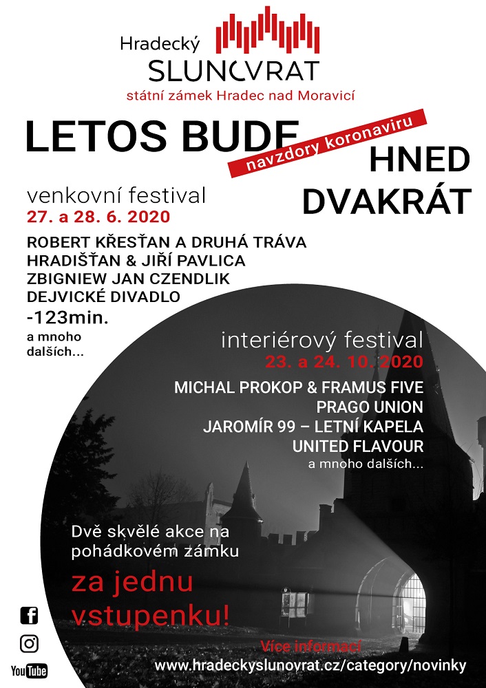 Neméně atraktivní program v historických prostorách Červeného zámku se chystá ve druhém dějství letošního Hradeckého slunovratu na konci října. Kromě všech českých interpretů z původního line-upu se budeme snažit přivézt také některé z těch zahraničních a přichystat i další překvapení. Podrobný program budeme průběžně zveřejňovat. „Velmi si vážíme toho, že naše skvělé publikum nevrací zakoupené vstupenky. Jen díky solidaritě všech příznivců Hradeckého slunovratu můžeme tyto nelehké časy překonat a nabídnout Vám ještě lepší program,“ říká ředitel festivalu Vašek Müller. „Celý organizační tým pracuje zadarmo, jsme parta dobrovolníků a nadšenců, to nás určitě spojuje s našim publikem,“ dodává. „I proto jsme v tom otravném mezidobí koronaviru připravili více než dvacet streamů s hvězdným obsazením od Ivana Trojana, generála Petra Pavla, Michala Prokopa, Alexandry Alvarové k Bohumilu Pečinkovi a mnoha dalším. Ale stejně se nejvíce těšíme, až se s Vámi zase uvidíme na festivalu naživo, a to hned dvakrát!“ Přes rozestupy k sobě budeme mít blíže