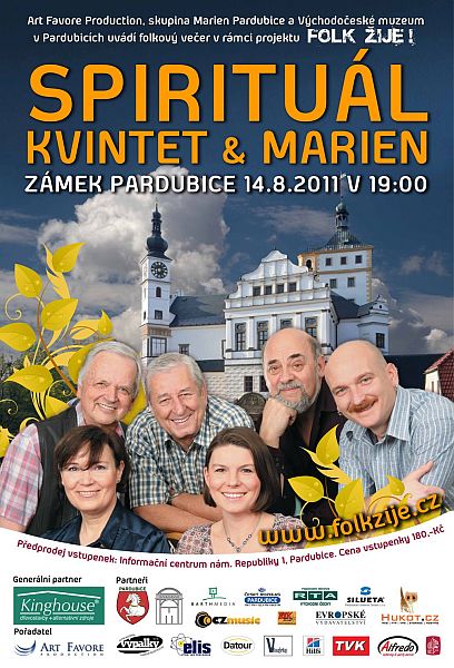 Koncertní večer se koná v rámci projektu FOLK ŽIJE! Jedná se o širokou kampaň, sdružující kapely, akce, festivaly a příznivce za účelem popularizace tohoto žánru, přičemž si klade za cíl upozornit na mladou folkovou scénu. Projekt zahájil již v prosinci minulého roku kampaní v Pardubicích a do projektu se postupně aktivně zapojují hudební skupiny po celé republice, stejně tak žánrové koncerty a festivaly. S nápadem přišla pardubická skupina Marien kolem písničkáře a hudebního publicisty Víti Troníčka. Po boku Marien a Pavučiny z Pardubic stanuli další mladí, jako jsou například Žamboši ze Vsetína, Passage- Prahy, nebo Stráníci z Litvínova. Z „ostřílených pardálů“ jako první stanul Pavel Žalman Lohonka a mezi dalšími jsou například Nezmaři, Slávek Janoušek nebo Spirituál Kvintet, a celá řada dalších co se nestydí za to že jsou folkaři. Kulturní program na zámeckém nádvoří má zajistit určitou kulminaci celého projektu a má přímou návaznost na promenádní koncerty s názvem Folk na Příhrádku (31.7. a 28.8). Jde o realizaci společného koncertu hvězdy české folkové scény Spirituál kvintet a skupiny Marien. Bude se konat v neděli 14.8. od 19:00 v úžasném prostředí na nádvoří Zámku Pardubice. Spojení folkové hudby a romantických prostor historických objektů, zajímavé nasvícení a kvalitní zvuk jistě dokáže vytvořit neopakovatelnou atmosféru a jedinečný zážitek. Kapacita míst v hledišti je ovšem omezena proto rozhodně doporučujeme využít možnosti zakoupit si vstupenku v ceně 180,-Kč v předprodeji Informačního centra na nám. Republiky v Pardubicích, nebo v pokladně na zámku. Více na www.folkzije.cz Sdílet na... Kam dál? » Pernštejnská fortuna – pestrá, slunečná a nezapomenutelná (Jana Štěpánková)» V nejlepších letech Marien přibrzdili (Tomáš Hrubý)» Prezident na Hrad (Belmondo)» Nová média Českého rozhlasu (Ivan Kurtev)» 47. ročník Porty v Řevnicích se blíží (FOLKtime.cz)