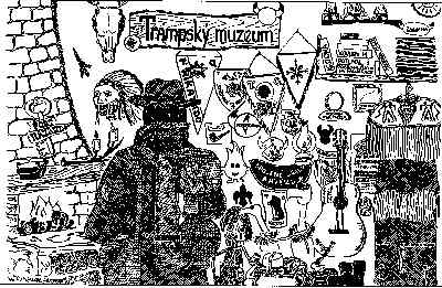 novej - a přesto sem vo něm v životě neslyšel. Tydle končiny byly dycky dost mrtvý a teď takovejhle vejstavní kus. Dobrodím teda ke dveřím (z komína se kouřilo) a zaklepu. Nic. Znova - a zase nic. Strčím do dveří a jak je u nás dobrým zvykem, jsou votevřený. Vlezu tam, hlavu mi neutrhnou a i kdyby. Je to lepší než zmrznout. Čumím dost vyjeveně a nejdřív na krb. Hoří tam, ale nejvyšší čas přiložit. Srovnám na voheň pár polen, usárna už mi stojí vopřená u dveří, a začínám se rozhlížet.Proti vchodu visí veliká cedule "Trampský muzeum". Vokolo stěn všelijaký vitríny, knihovny, police, všecko dřevěný. Vomrknu to zblízka. Nejdřív knihovna. Vobhlížím hřbety a čtu "Arizona", "Dobrodružství na Černé řece", "Potlach", "Dějiny trampigu", "Z dýmu táboráků", "Hovory H" atd. Vedle knížek stojí vyrovnaný snad všechny trampský časopisy co kdy kde vycházely, vod předválečnýho "Trampa" a "Naše osady" po "Lokálku" a "Dým" dneška. Ukončený ročníky vázaný v kůži, zelený nápisy, no jak na přehlídce. Du dál. Před sebou vidím vopravdu muzejní pozůstatky trampskejch dějin. Vlaječky, odznáčky, domovenky, pingl Boba Hurikána, vlas Wabiho Ryvoly, fous Kapitána Kida, kytaru trampského slavíka Houly. A moře a moře dalších zajímavejch věciček, nebudu unavovat.