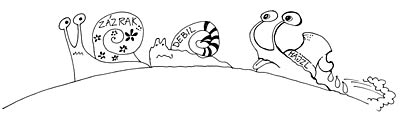 "Budíček!" zahalekali jsme čtyřhlasně. "Už zas?" ozval se otrávený hlas Velkého Gauče. "To už jste tu zas? Vždyť letos jste u nás na návštěvě už byli!" "To je sice pravda," souhlasil jsem, "ale vy ihned vstanete, nebo dojdeme pod kopec pro vodu a vy zažijete pořádnou sprchu." "Tak z toho mám opravdu strach," kejval hlavou Jirka zvaný Ležák. "Už vidím Lenochy, jak pro nic za nic lezou z kopce a zas zpátky! A ještě k tomu s vodou." "Dobře, ušetříme vás," řekl jsem odpouštějícím tónem, protože moje hrozba opravdu stála na špatných základech. "Ale stejně staňte. Přišli jsme vás vyzvat k zítřejšímu souboji." Gaučové pomalu vstávali a sedali se s námi do kruhu. Honza chtěl sundat k krku kalumet, ale Velký Gaučo udělal rukou zamítavé gesto. "Není třeba kouřit dýmku míru. Jednak jsme ji vykouřili letos na jaře a potom, měli jsme výborný oběd a neradi bysme o něj kvůli vaší výtečné tabákové směsi přišli." Pokrčili jsme rameny a začali jednat. Protože Gaučové k našim návrhům neměli moc připomínek a protože nikdo z nich nezdržoval neustálým odbíháním jako na jaře, byli jsme za chvíli hotovi. Velký Gaučo se zvedl a slavnostně přečetl podmínky závodu: - Start je v 9.00, kdo se nedostaví, bude diskvalifikován - Každá strana postaví maximálně tři barevně odlišené plaziče - Gaučové použijí startovních čísel 1, 3, 5; Lenoši 2, 4, 6 - Délka tratě metr padesát - Noční trénink dovolen Vyšli jsme před Stlukjanku a Olda se podíval na hodinky. "Je šest, sejdeme se u sedmi smrků v osm hodin. Sbírejte všechno co má ulitu, pak uděláme konkurs." A vyrazili jsme hledat budoucího vítěze. V osm jsme se sešli. Já neměl nic, stejně tak Olda a Fáňa. Jen Honza sáhl do kapsy a pomalu, tajemně otevřel pěst. Úplně jsem ztuhnul. Neprobudili jsme se v šest, ale v půl osmý. Ani já neměl štěstí. Bylo za deset minut devět, když jsem potkal Fáňu. Měl trpkost v očích a neřekl ani slovo. Šli jsme pomalu z kopce a živili v sobě ohýnek naděje. Že třeba Honza nebo Olda? Asi ze sta metrů jsme je uviděli. Stáli u startovní čáry, hlav svěšený. Zatím, co jsme v klidu obědvali, na devadesátém druhém centimetru zuřil urputný boj mezi Zázrakem a Debilem. Daleko za touto dvojicí zůstal Hajzl, Hovado zůstal na startu. Ani se nehnul.