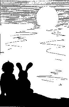 Vedle toho kluka - hezky na sluníčku - tam totiž seděl půlmetrovej fialovej zajíc v zelených trenýrkách a bílým triku. Zubil se na nás - a huňatou fialovou packou si vyklepával vodu z plyšovýho ucha.