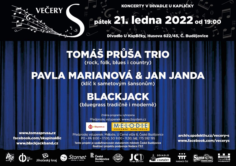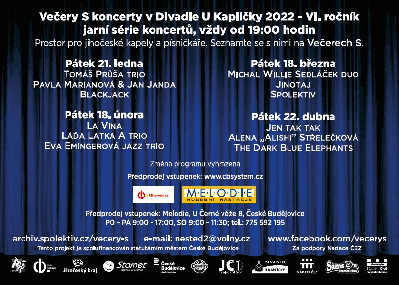 V pátek 21. ledna 2022 začíná šestý ročník hudební série Večery S. První tóny prvního ze čtyř jarních koncertů, na kterých se postupně představí 12 účinkujících, zazní v 19:00 hodin v Divadle U Kapličky v Českých Budějovicích. Patronem Večerů S pro rok 2022 je Pavel Jarčevský, mnoho let známý organizátor hudebních festivalů a člen znovuobnovené skupiny Jen tak tak. A hned při prvním koncertu se na jevišti setkáte s mimořádnými hudebníky a jejich autorskou hudbou, interpretovanou na velmi vysoké úrovni.