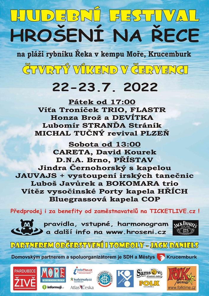 Dvoudenní hudební festivaly HROŠENÍ NA ŘECE se odehrávají na pláži rybníku ŘEKA v zavedeném retrokempu MOŘE s restaurací (Krucemburk - nedaleko Ždírce nad Doubravou, CHKO Žďárské vrchy) a jsou zaměřené na folk, bluegrass, country a trampskou i irskou muziku.