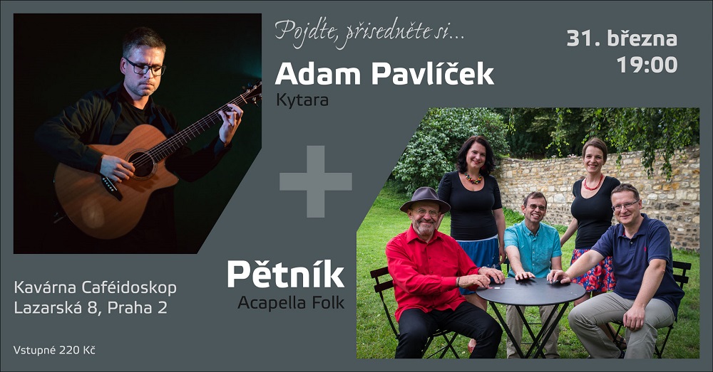 Ve čtvrtek 31. března od 19 hodin se v kavárně Cafeidoskop v pražské Lazarské ulici ke hraní a zpívání sejdou vokální skupina Pětník a sólový kytarista Adam Pavlíček. Možná máte u tohoto data v kavárně poznamenaného Frantu Vlčka, ale ten kvůli nemoci nám bude tentokrát jen fandit na dálku. A co vás čeká?