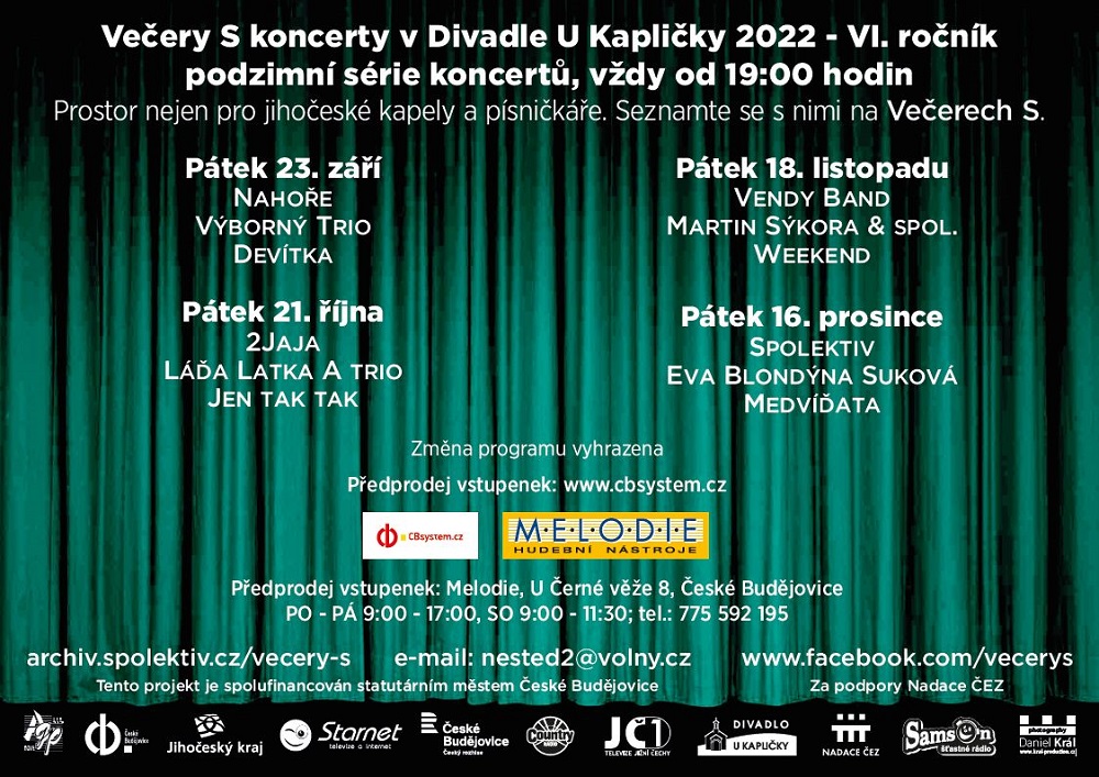 Je pro vás připravený hudební mix s jasným záměrem, že Večery S jsou prostor nejen pro jihočeské kapely a písničkáře. Je jich hodně, jsou zajímaví, ale někdy se o nich tolik neví. Večery S vás s nimi seznámí. Tak přijďte a objevujte.