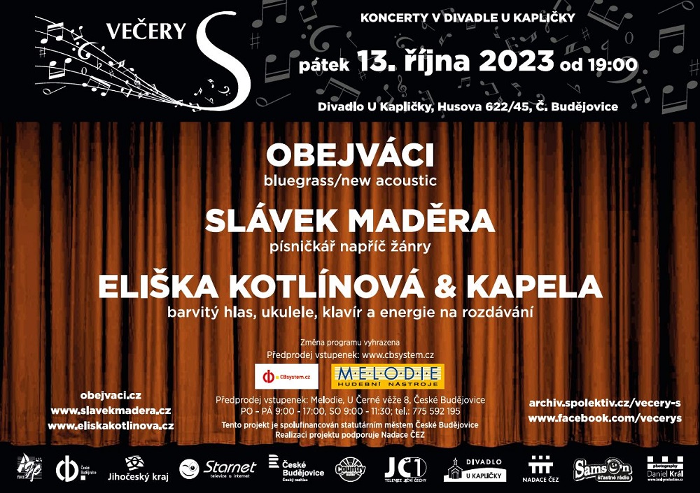 Milí přátelé a fanoušci Večerů S! Sedmý ročník hudební série Večery S koncerty v Divadle U Kapličky 2023 a jeho podzimní část je v plném proudu. V pátek 13. října 2023 od 19:00 hodin Vám tentokrát nabídneme výhradně autorskou tvorbu jak po stránce textové, tak i hudební! Pětičlenná jihočeská kapela Obejváci zahájila svou kariéru na konci roku 2021. A kde jinde, než v obýváku! Ten posloužil i jako prostor pro „domácí-obývákové“ nahrání prvních společných skladeb. Obývák v názvu kapely zůstal, určitě ale není jediným místem, kde můžete kapelu slyšet. Za sebou má kapela několik vystoupení i nahrávání demo singlů. Hudebním mozkem kapely je kytarista Luboš Maškara Barchini, řadu písní složila také zpěvačka Kristýna Barchini. Kapelu doplňuje houslista a mandolinista Jan Pelech, banjista Lukáš Šebesta a na kontrabas Karel Kačer. Písničkář a textař Slávek Maděra o sobě říká: „Moje muzika je spíš „neškatulková”, ale jak je u nás zvykem, co se hraje na akustické kytary, se zevšeobecňuje na folk. Umě je to spíš ta akustická muzika, i když ani to není přesné, protože používám elektroakustickou kytaru.“ Chceme-li tedy Slávkovo tvorbu upřesnit, pak se jedná o akustickou hudbu bez škatulek a Slávek Maděra je vnímán jako písničkář napříč žánry. Jeho tvorba je vskutku osobitá a silná po textové i hudební stránce.Eliška Kotlínová pochází z Vodňan. Zpívá a hraje na ukulele, kytaru a klavír. V současné době vystupuje s autorskou tvorbou za doprovodu kapely. Hudba a texty, které píše, jsou inspirovány jejím běžným životem. Hudebně se nebrání žádnému žánru, což je v její hudbě znát. Při vystoupeních se na posluchače valí nejen její barvitý a výrazný hlas, ale i pozitivní energie, které má při zpívání na rozdávání. Aktuálně vydala autorské album O mně, které pokřtí 17. listopadu na koncertě v Písku.