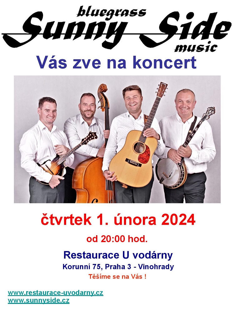 Vážení přátelé a příznivci dobré muziky, dovolujeme si Vás co nejsrdečněji pozvat na hudební večer s kapelou Sunny Side a to ve čtvrtek 1. února 2024 od 20:00 hodin do restaurace U Vodárny, Korunní 75, Praha 3 – Vinohrady.