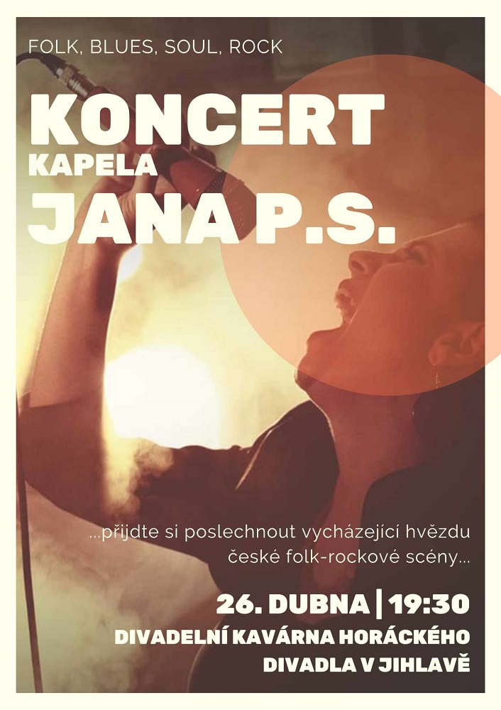 Jana P.S. s velkou kapelou srdečně zve na koncert do Divadelní kavárny Horáckého divadla v Jihlavě, který se uskuteční v pátek 26. dubna od 19:30 hodin.