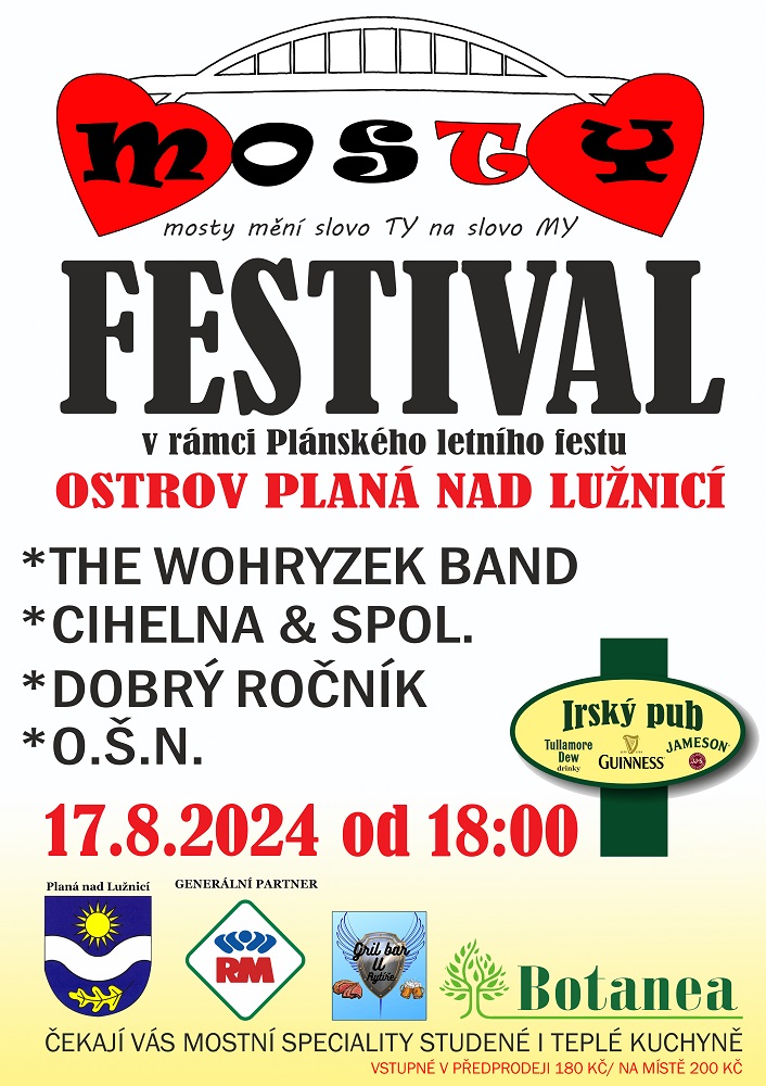 Folkrocková Cihelna a spol., která pod vedením principála Marka Cihláře spolu s mladými hudebními parťáky zraje jako víno. Folk s vínovým nádechem předvede uskupení Dobrý ročník. Tady to zrání jde také velmi dobrým směrem. Ač jsou na pódiích spolu krátkou dobu, jsou to všichni zkušení muzikanti. The Wohryzek band mají blízko k rockovému pojetí a tady, u Lužnice, jsou velmi populární. A do čtvrtice je zde parta zvaná O.Š.N., která ač avizuje, že jsou spolu 30 let, je za nimi rouška tajemna. Že by hudba 90. let? Nechme se překvapit. A na co lze ještě pozvat. Uvedu slova hlavního hybatele festivalu Mosty, již výše zmíněného Marka Cihláře: