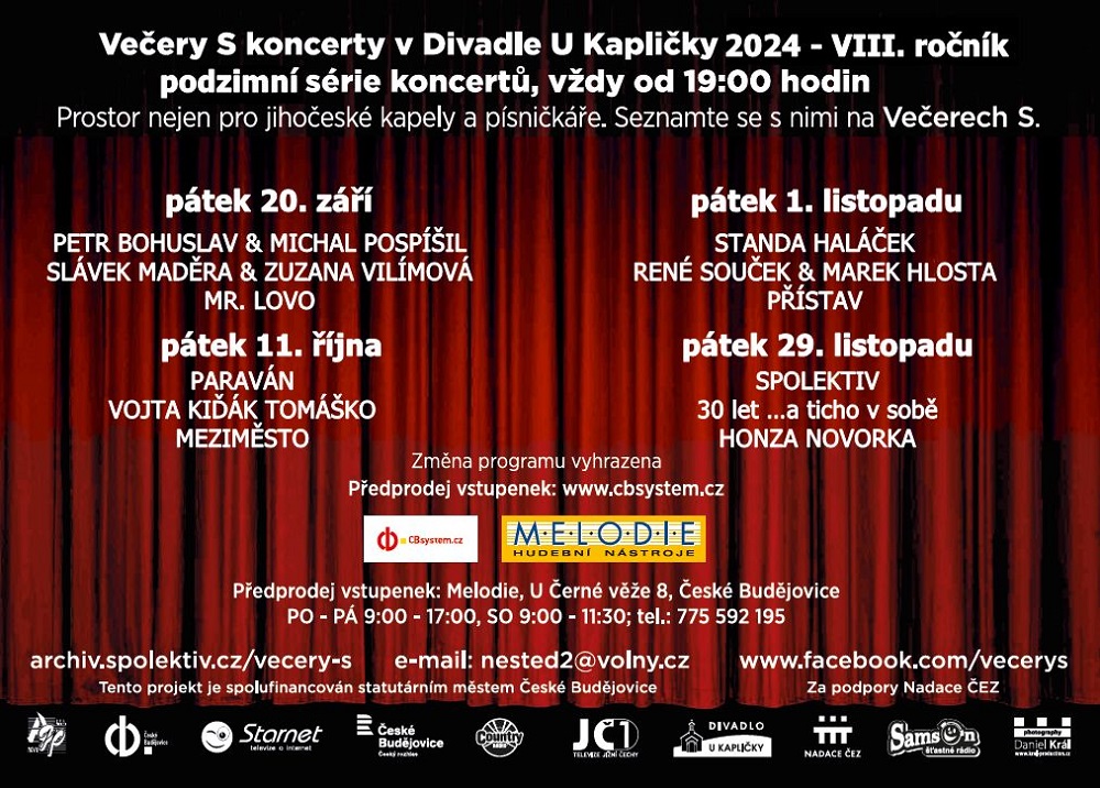 | 20.08.2024 Večery S 2024, podzimní program VIII. ročníku hudební série v Divadle U Kapličky v Českých Budějovicích (Jarda Hnízdil) |