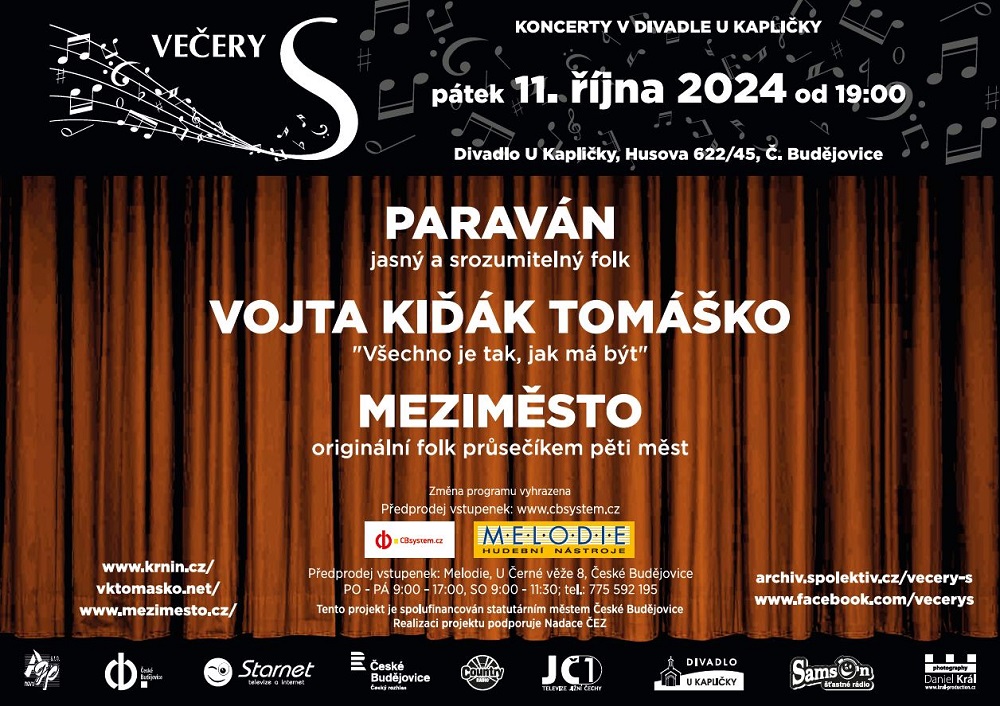 | 02.10.2024 Večery S v říjnu: Paraván, Vojta Kiďák Tomáško, MeziMěsto (Jarda Hnízdil) |
