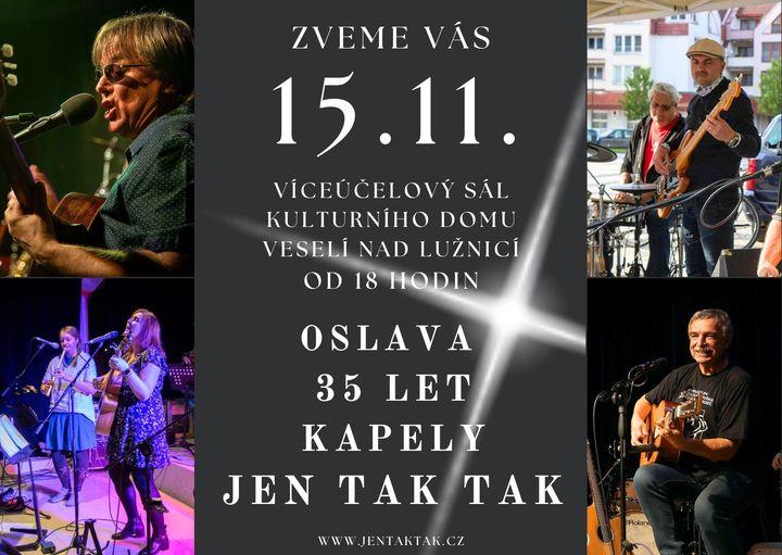 Jihočeská folková kapela Jen tak tak slaví letos 35 let na hudební scéně. Rozhodli se toto výročí důstojně oslavit a proto je rozděleno na dvě části. Obě se uskuteční v kulturním domě ve Veselí nad Lužnicí.