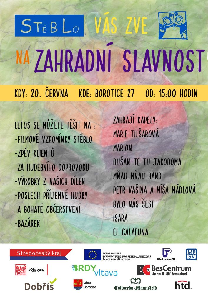 Zahradní slavnost se koná 20. června od 15:00 hodin v Boroticích 27 a těšit se můžete na filmové vzpomínky Stéblo, zpěv klientů za hudebního doprovodu, výrobky z dílen Stébla, poslech příjemné hudby, bazárek a bohaté občerstvení.
