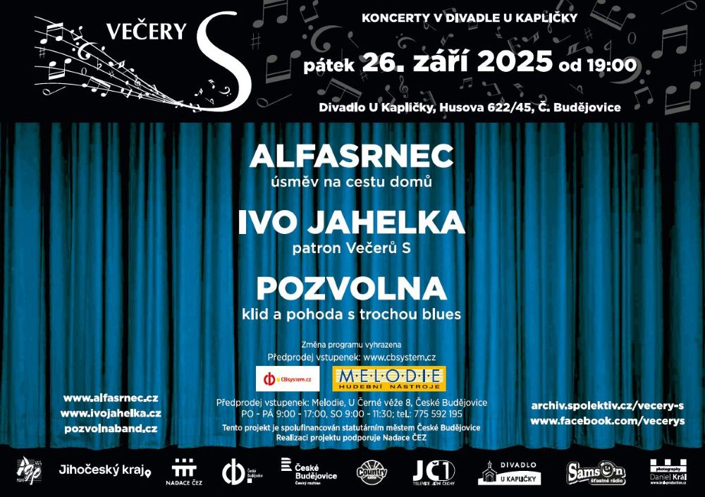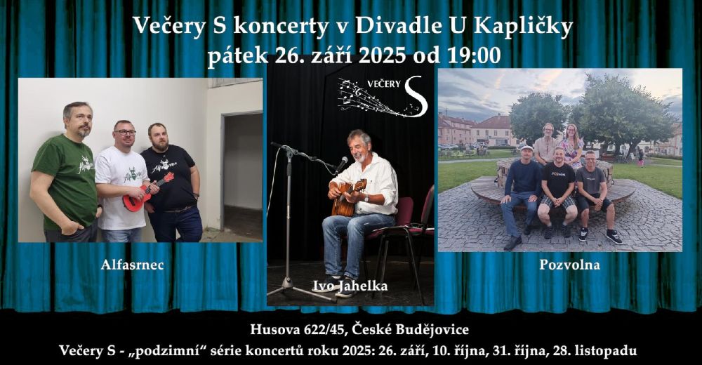 Vážení příznivci dobré muziky a Večerů S. Tak nám pozvolna končí léto a čeká nás podzimní série koncertů Večery S v divadle U Kapličky v Českých Budějovicích. Letní festivaly sice jistě nabídly spoustu báječné muziky, ale jako patron „Večerů S“ musím konstatovat, že se těším na neopakovatelnou atmosféru a hudební koktejl, který opět mistrně namíchal Jarda Hnízdil.