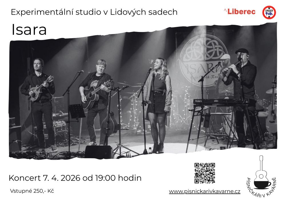 Písničkáři v kavárně v novém prostoru krásně zrekonstruovaného Experimentálního studia v libereckých Lidových sadech: ISARA – hudební skupina, věnující se hudbě britských ostrovů – tedy Anglie, Skotska a Irska. V úterý 7. dubna od 19 hodin...