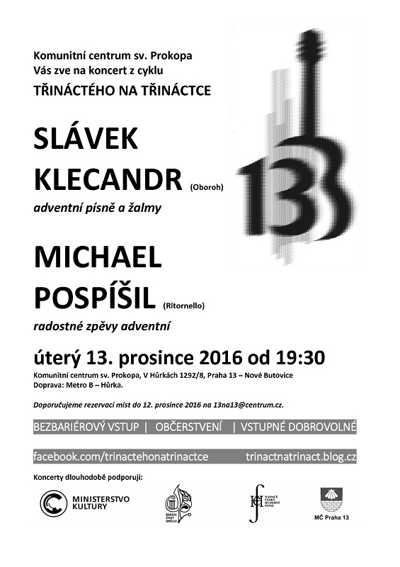 Koncert se koná v úterý 13. prosince 2016 od 19:30 v Komunitním centru sv. Prokopa na Slunečním náměstí v pražských Nových Butovicích (metro Hůrka). Doporučené vstupné 100 Kč, bezbariérový vstup. Více informací najdete na webových stránkách http://www.trinactnatrinact.blog.cz. Večery dlouhodobě podporuje Ministerstvo kultury ČR, MČ Praha 13 a Nadace Život umělce. Sdílet na...