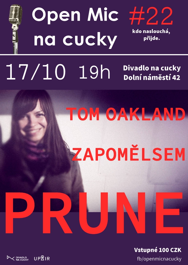 Nadějná brněnská zpěvačka Prune, lo-fi folkový písničkář Zapomělsem a česko-anglický bard Tom Oakland. Tato koncertní nabídka láká na dvaadvacátý olomoucký písničkářský večer Open Mic na cucky. Koná se poprvé v nových prostorách Divadla na cucky na Dolním náměstí 42 v úterý 17. října 2017. Akce začne v 19 hodin.