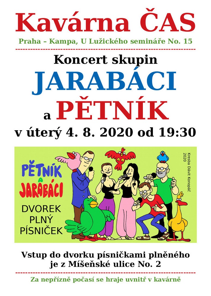 Ten druhý dech byl a je velice šťastným! Obrazilo se to i na posledních třech výborných CD z celkem pěti, která Jarabáci vydali. Na posledním z nich, na Býčkovi z loňského roku, se uplatnil už i nejnovější člen kapely, cajoník a pěvecký sborista David Nesnídal... Na Býčka a snad i na některá další jarabácká alba se můžete těšit při koncertě ve dvorku. A navíc: velmi milé překvapení pro vás údajně připravuje i Dávit Konopáč! Moc se těšíme na vaši návštěvu tohoto dvoukapelového koncertu ve dvorku Kavárny ČAS se vchodem z Míšeňské ulice č. 2. Mokrou variantou koncertu je interiér kavárny se vchodem z ulice U Lužického semináře č. 15. Ať tam či onde, bude tam připraven klobouk, do něhož budete moci v průběhu večera odkládat ve prospěch muzikantů drobné bankovky v libovolném množství. Abyste si za ně užili opravdu všechno, co prožíti lze, bude dobré a milé, budete-li v hledišti přítomni opravdu již v půl osmé večer.