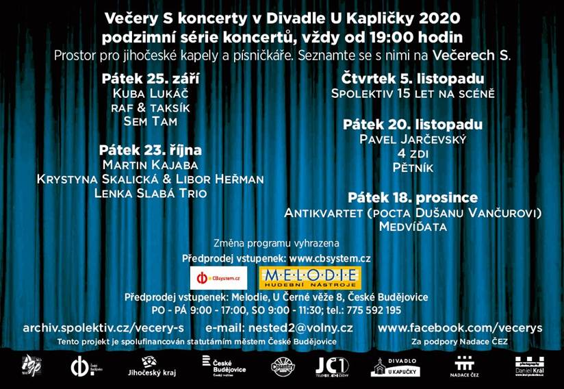 Po dlouhé přestávce, pandemické i letní, pokračuje podzimní část čtvrtého ročníku hudební série Večery S koncerty v Divadle U Kapličky na Husově třídě v Českých Budějovicích. Diváky čeká nabitý program pěti koncertů, první z nich je připraven na tento pátek 25. září 2020.