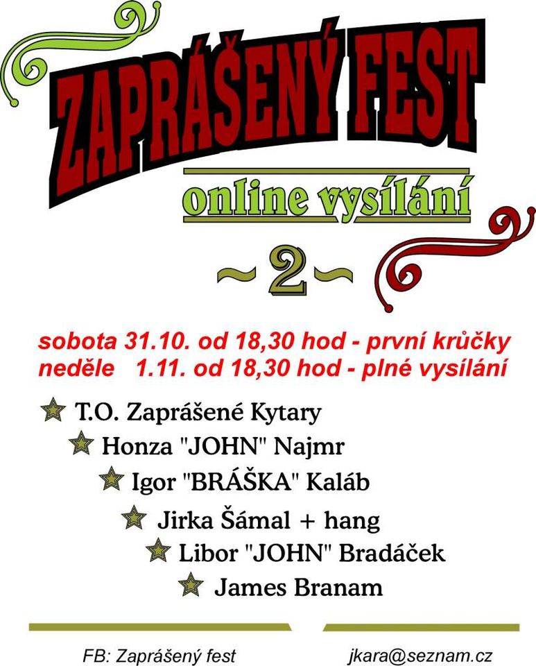 31. 10. - Mňága a Žďorp - best of - MALL.TV nebo Facebooku - 20h 31. 10. a 1. 11. - Zaprášený fest - FB vždy v 18:30 - v sobotu zazní jedna píseň, v neděli od každého z písničkářů po třech písních, interpreti na foto 1. 11. - Waldovy Matušky - Kultura přežije - FB - 16h 1. - Jarda Kříž z Crossbandu - Podzim 2020 - FB - 18h 1. - Petr Bende - FB interpreta - čas upřesní 1. - Monty - Všechny písně vol.1 - FB, YB - 17h 5. - Z gauče do Druhého Pádu - multižánrové hraní na FB Kultura žije - vystoupí např. Ateliér, OKno či Pavel Čadek - 17:00 - 22:30 5. - Jan Řepka - Zpěvy hřbitovní - YB - 21h 14. 11. - Petrova Cihelna - stream se připravuje Tak se všichni opatrujte ve zdraví.