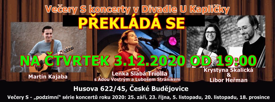 Koncert 5. 11. 2020 v rámci Večerů S koncerty v Divadle U Kapličky Spolektiv 15 let na scéně se tento den ruší a překládá na neurčito. Kontaktujte mě, prosím, vy, kdo máte vstupenky pořízené z předprodeje.