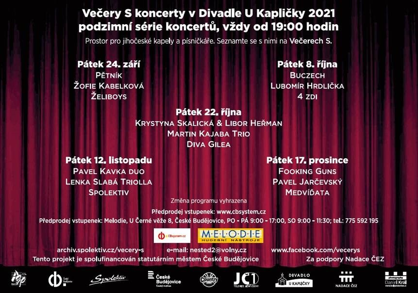 Milí přátelé a fanoušci Večerů S! Rok nebylo možné pořádat Večery S koncerty v Divadle U Kapličky. Rok se ale s rokem téměř sejde a první letošní koncert hudební série Večery S koncerty v Divadle U Kapličky 2021 začíná v pátek 24. září 2021 od 19,00 hodin.