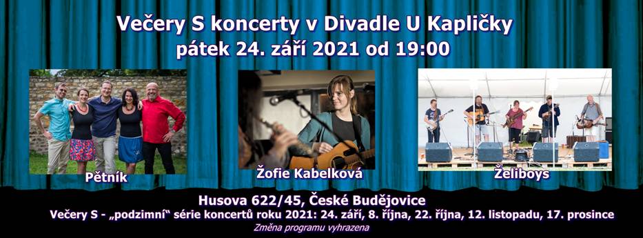 | 08.09.2021 Večery S: Pětník, Žofie Kabelková, Želiboys (Jarda Hnízdil) |