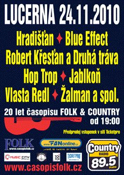 Lucerna 24. listopadu 2010. Hudební měsíčník FOLK & COUNTRY (od letošního ledna už jen FOLK) oslaví na konci roku dvacáté narozeniny. Slavit s časopisem budou dále Hradišťan, Blue effect, Robert Křesťan a Druhá tráva, Vlasta Redl, Žalman a spol., Hop trop a Jablkoň. Uvádí Jiří moravský Brabec a Petr Sedláček. Vstupenky v síti Ticketpro, ceny 650, 500, stání 300 Kč, začátek 19:00. Zatímco jiné hudební magazíny přicházely a odcházely, „efcéčko“ vydrželo. A ustálo i postupný příklon čtenářů tiskovin k internetu. Dvacetiletí časopisu se zároveň kryje se čtyřiceti lety od prvního vstupu lidí z legendárního Folk & Country Klubu na hudební pódia; byl to tenkrát Folk & Country Festival v Lucerně v prosinci 1970. Od té doby tahle parta lidí tvořila za hodně nepříznivých podmínek festivaly jako Svojšický slunovrat a Letorost, Českokrumlovský folkový festival, a dnes hlavně festivaly Zahrada a Folková růže. A také porodila a byla u vývoje hudebních pořadů v Malostranské besedě i v úspěšných osmdesátých letech v Klubu na Petynce. To vše se bude připomínat na velkém koncertu 24. listopadu 2010 v pražské Lucerně. Když přijdete, dostanete jako dárek letošní prosincové číslo časopisu zdarma. A také si tam můžete předplatit časopis na rok 2011 s 25% slevou nebo si vybrat z nabídky letos vyšlých hudebních nosičů. Nepropásněte to. Další oslavy budou až v listopadu 2020. Sdílet na... Kam dál? » Spirituál kvintet v Lucerně: silná oslava jedné miliardy sedmi set miliónů vteřin (Tomáš Hrubý)» Jihoamerická královna world music Susana Baca přiletí do Prahy 10. Května! (David Gaydečka)» Martin Hrubý vydává druhé studiové album Lucerna v moři (FOLKtime.cz)» Galakoncert k nedožitým 70. narozeninám Michala Tučného (Zdena Selingerová)» The Swell Season 2010 – stále bezprostřední, ryzí a podmaniví (Jan Řepka)