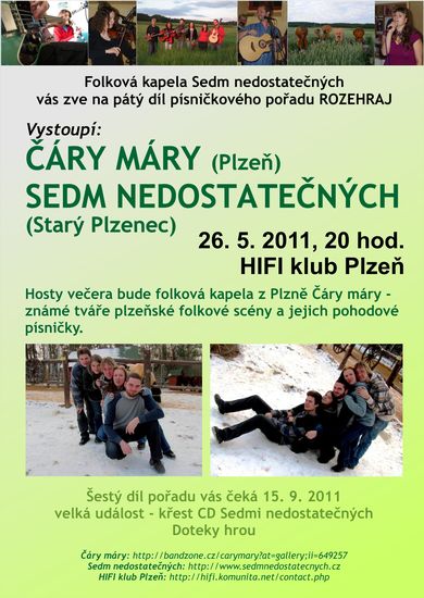 V plzeňském Hifiklubu si již 26. května můžete poslechnout a užít 5. díl písničkového pořadu ROZEHRAJ, pořádaného kapelou Sedm nedostatečných. Hostem večera budou plzeňští Čáry máry.