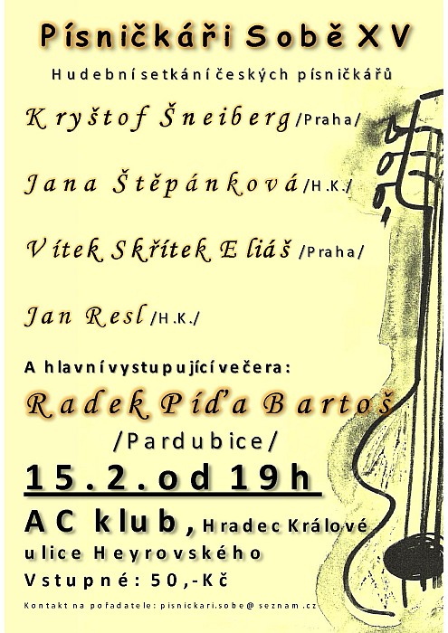 V letošním roce poprvé, ale jinak už po patnácté se 15. 2. od 19:00 v AC klubu v Hradci Králové uskuteční další setkání písničkářů. Poslední Písničkáři sobě odehráli své vystoupení v polovině prosince loňského roku, tedy před dvěma měsíci. Tento dvouměsíční interval a zvolený den středu bychom chtěli udržet i nadále. Na únorovém koncertu tentokrát vystoupí: KRYŠTOF ŠNEIBERG z Prahy, VÍTEK SKŘÍTEK ELIÁŠ z Prahy, JAN RESL z Hradce Králové, troškou ze své tvorby přispěji k hudebnímu zážitku i já a jako hlavní host přijede z nedalekých Pardubic RADEK PÍĎA BARTOŠ, kterého můžete znát z kapel, např. Baboraď, Pidilidi nebo také Marien.