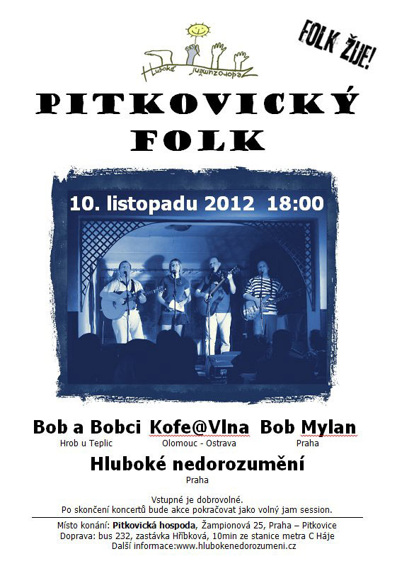Letní festivaly skončily, ale to neznamená, že by se přestávalo zpívat. Jednou z tradičních indoorových akcí je pražský Pitkovický Folk, k jehož 15. pokračování vás 10. 11. od 18:00 zve pořádající skupina Hluboké nedorozumění. I tentokrát jsou pozváni zajímaví hosté. Pokud si pamatujete úspěšnou ostravskou kapelu I.C.Q, můžete tušit, co očekávat od jejího volného pokračování, kterým je duo Kofe@Vlna. Pokud netušíte, o to spíše přijďte. Uslyšíte pestrou a originální muziku, kterou nebudete moci ještě nějakou tu chvíli po koncertu vyhnat z hlavy. Dalším hostem je severočeská skupina Bob a Bobci. Můžete se těšit na její pohodové písně a mimo jiné také na dokonalý soulad tří ženských hlasů. Poněkud z jiného soudku je poslední host. Bob Mylan je velice svérázný písničkář, který se objevuje na pódiu opravdu výjimečně, ale nikdy nezůstane nepovšimnut. Jeho písně jsou plné silných motivů ze života a odnesete si z nich i ponaučení. Možná se během jeho krátkého vystoupení v Pitkovicích dozvíte, co dělat, když vám vypadnou Windows nebo kde brát vodu do chladiče. Ale také se můžete dozvědět něco úplně jiného. Přijďte si poslechnout, jaký repertoár Bob Mylan zvolí.
