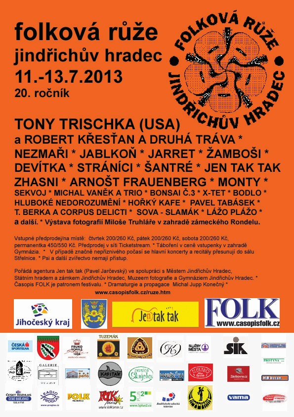 Dvacátý ročník festivalu FOLKOVÁ RŮŽE v Jindřichově Hradci se koná ve dnech 11. – 13. července 2013.