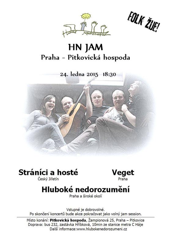 Zveme vás na 5. HN Jam, který se uskuteční již tuto sobotu 24. 1. od 18:30 v Praze – Pitkovicích. Tradičním hostem lednových koncertů našeho Hlubokého nedorozumění jsou Stráníci, kteří vždy dokáží z pódia rozdávat svými písněmi dobrou náladu. Vůbec jsme se rozhodli na koncertní rozjezd zvolit jako téma klídek a pohodu. Tomu odpovídá už podle názvu i druhý host, kterým je pražská bluegrassová skupina Veget. Mimoto jsou Stráníci známí tím, že sebou do Pitkovic přiváží i další výborné muzikanty, a tak se můžete těšit také na Petra Rímského a Otu Maňáka. Předpokládáme, že po skončení koncertní části večera vypukne také tradiční jam session. Vstupné je dobrovolné.