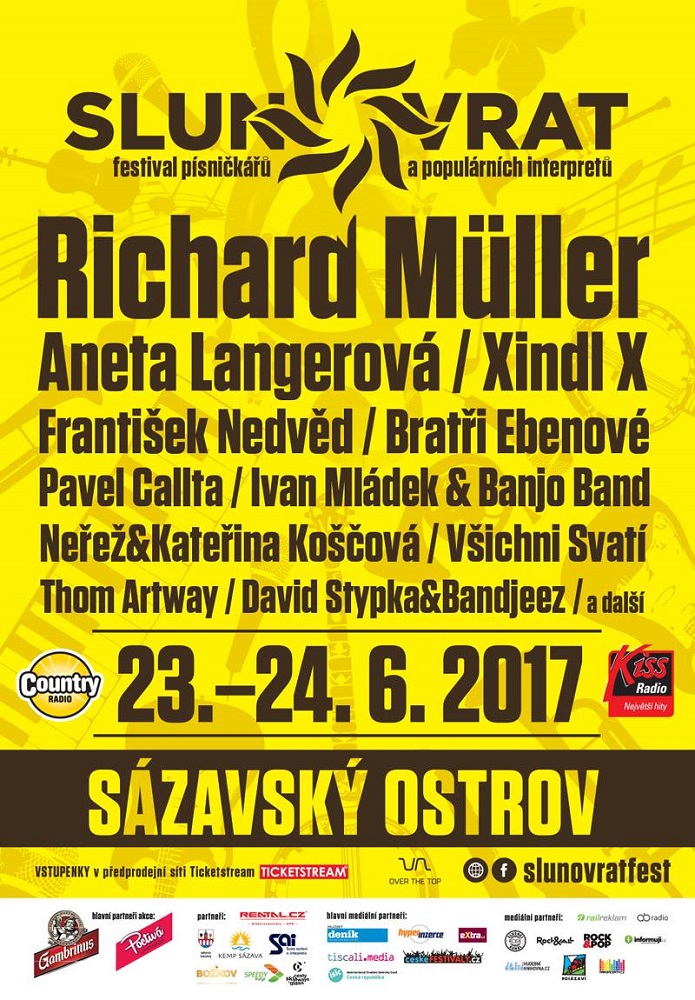 „Už jako malý kluk, jsem poslouchal písničky bratří Nedvědů, a dá se říci, že jsem na této muzice prakticky vyrostl. Tak jako Pavel Callta zahájí sobotní festivalový den, zahájím i já slavnostně páteční speciální program Jessy Jones vs Emily Willispornmobilefestivalu Slunovrat.“ Vysvětluje mladý zpěvák. „František Nedvěd letos oslaví své významné životní jubileum – 70 let, Miro si speciálně pro něj připravil narozeninové překvapení,“ říká ředitelka festivalu Nikol Poselová. 23. – 24. června 2017 v areálu vodáckého kempu Sázavský ostrov v Sázavě na Benešovsku vystoupí tito umělci: PÁTEK 23. ČERVNA 17.00 – 17.30 – Miro Šmajda – Akustický set – Slunovrat Stage 17.45 – 18.15 – Šouflšou – Muzikus Stage – 4. místo v talentové soutěži Slunovrat 18.15 – 19.30 – František Nedvěd – Slunovrat Stage 19.30 – 20.15 – Four in Van – Muzikus Stage 20.15 – 21.30 – Xindl X – Slunovrat Stage 21.30 – 22.10 – Petra Göbelová – Muzikus Stage 22.10 – 23.00 – Všichni Svatí – Slunovrat Stage 23.00 – 23.40 – Die Kabelka – Muzikus Stage SOBOTA 24. ČERVNA 11.00 - 11.50 – Pavel Callta - Slunovrat Stage 12.30 – 13.30 – Bratři Ebenové – Slunovrat Stage 13.30 - 14.10 – The Lazy Bones – Muzikus Stage - 3. místo v talentové soutěži Slunovrat 14.10 – 15.00 – Thom Artway – Slunovrat Stage 15.00 – 15.40 – Fragmenty – Muzikus Stage 15.40 – 16.30 – David Stypka & Bandjeez – Slunovrat Stage 16.30 – 17.10 – Tereza Jakobová – Muzikus Stage – 2. místo v soutěži Slunovrat 17.10 – 18.10 – Neřež & Katka Koščová – Slunovrat Stage 18.10 – 18.50 – Tamdoletma – Muzikus Stage – 1. místo v talentové soutěži Slunovrat 18.50 – 19.50 – Richard Müller – Slunovrat Stage 19.50 – 20.30 – Natural – Muzikus Stage 20.30 – 21.40 – Aneta Langerová – Slunovrat Stage 21.40 – 22.20 – Mrakoplaš – Muzikus Stage 22.20 – 23. 20 – Ivan Mládek Banjo Band – Slunovrat Stage 23.20 – 00.00 – Liwid – Muzikus Stage Přijet na festival můžete karavanem nebo i po proudu řeky Sázavy raftem nebo lodí. Úschovna lodí bude zajištěna. Ubytovací kapacita areálu je již zaplněna, ale pro další návštěvníky bude přichystáno stanové městečko a V.I.P. stanové městečko. Pro rodiny s dětmi bude připraven dětský koutek s hlídáním, dětská hrací zóna, loutkové divadélko Schubert, skákací hrad a mnoho dalšího. Pro malé návštěvníky bude zaveden takzvaný "dětský catering" pro chutné a zdravé stravování na kulturních akcích. Děti do 6 let a 110 cm mají v doprovodu dospělého s platnou vstupenkou vstup zdarma. V předprodeji jsou také V.I.P. vstupenky, které za příplatek nabízejí divákům sezení u pódia, vstup do V.I.P. zóny, V.I.P. parkoviště, V.I.P. stanové městečko přímo v areálu Sázavského ostrova, luxusní toalety a sprchy.