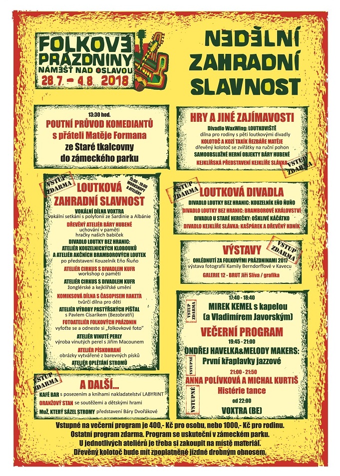 Hlavní program: http://www.folkoveprazdniny.cz/index.php/program/hlavni-program Folkové prázdniny 2018 Náměšť nad Oslavou 28. července – 4. srpna O paměti Sdílet na... Kam dál? » Folkové prázdniny 2018 - O paměti (FOLKtime.cz)» Druhá tráva s Michalem Pavlíčkem na Folkových prázdninách v Náměšti nad Oslavou (Vladimír Béďa Halm)» Hudební skvosty britské folkové scény opět ozdobí Folkové prázdniny (FOLKtime.cz)» Neobyčejná mezinárodní hudební setkání na Folkových prázdninách (FOLKtime.cz)» Folkové prázdniny 2018 začínají, seznamte se s dalšími novinkami (FOLKtime.cz)