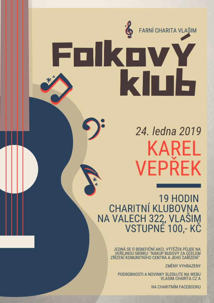 Další nabídkou, se kterou přichází Farní charita Vlašim, je Folkový klub. Svá vystoupení zde budou mít písničkáři a písničkářky. Jde o pravidelné koncerty, které se budou konat každý čtvrtý čtvrtek v měsíci od ledna do května. Začátky byly stanoveny na 19 hodin. Věříme, že si klub nalezne své posluchače a příznivce. Potom by koncerty pokračovaly i v podzimním období.