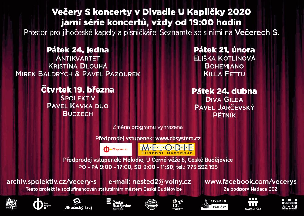 Patronem čtvrtého ročníku unikátního hudebního cyklu koncertů Večery S se tentokrát stane legendární Dušan Vančura. Návštěvníky čeká letos opět osm Večerů S, první tóny zazní v Divadle U Kapličky na Husově třídě v Českých Budějovicích v pátek 24. ledna 2020.