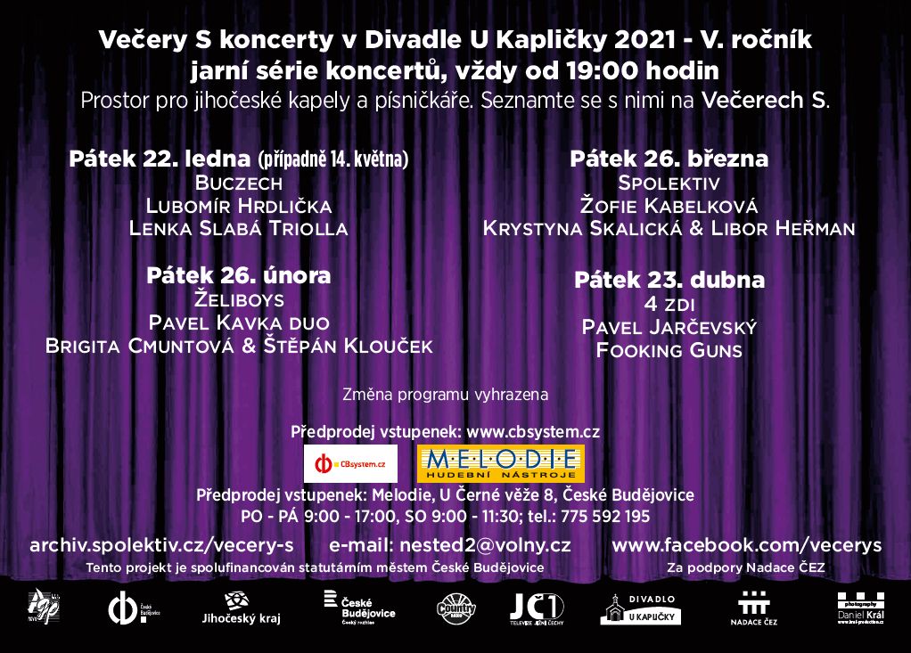 Vstupujeme do 5. ročníku Večerů S koncerty v Divadle U Kapličky 2021 s milou podporou Luboše Hrdličky, patrona ročníku. Jarní program hudební série Večery S je připravený. Je připravený, přestože vyhlídky pro pořádání koncertů jsou bledé, takové covidové… Pravděpodobně už pro lednový koncert 2021, pro který jsme rovnou připravili náhradní termín v květnu.
