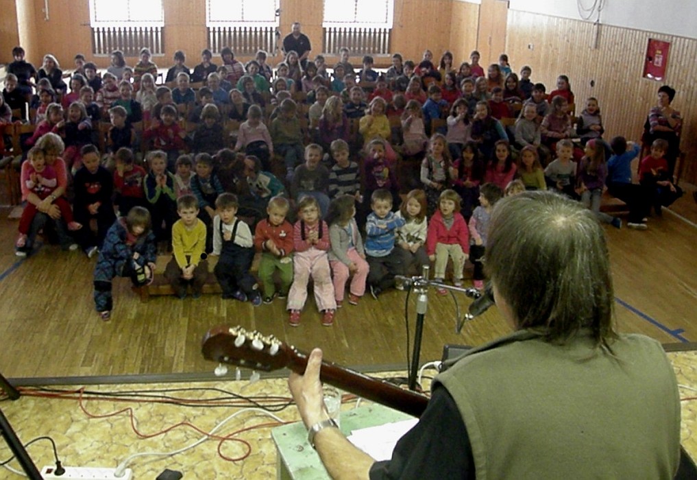 Vidět vystoupení Slávka Janouška 3x za jeden den (pátek 24. února) a přitom pokaždé jinak se hned tak nepoštěstí. Bonusem navíc a spojovacím článkem této jednodenní pidi šňůrky byl pomyslný křest jeho nového CD s (nejen)dětskými písničkami Dušičky. Pomyslný proto, že při prvním dopoledním koncertíku bylo v hledišti sokolovny v Mašově u Turnova na 100 dětí ze školky a prvního stupně základní školy a těm se nabízet nové CD jaksi prostě nehodí. Zato jim byla nabídnuta spousta písniček a jejich podání zvládnul Slávek i v 10h dopoledne na výbornou. Po x letech hraní a zpívání dětem a s dětmi na táborech moc dobře vím, že není vůbec jednoduché je zaujmout. V duchu jsem se musel smát, když jsem sledoval paní učitelky, jak pozorují jedním okem tu a tam nezbedné dětičky a občas vystartují, aby zasáhly. Jo, je to pořád stejné, já taky nikdy na koncertě nevydržel sedět v klidu. Slávek, maje výhodu své vlastní malé princezny doma, nenásilně s dětmi komunikoval a ty si s ním na oplátku nakonec i zazpívaly, když bez mrknutí oka přidal navíc písničky od svých kamarádů Samsona L. a Jarka N. Soudě podle bezprostřední reakce dětí, na bedně se z nového CD umístili Dva zajíci, Strašidlo skříňové a Pan Balabán.