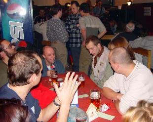 Na párty jsem dorazil někudy kolem 19 hodiny. Hned u prvního stolu mne odchytili manželé Rosendorfovi, což jsem uvítal. Měli tam místo k sezení a po dlouhé cestě z nejmenované osvěžovny, kde jsem marně čekal na Jaroose, přišlo vhod. Ani jsem si nesedl a už mne vítalo spousta lidí. Trošinku mne zarazilo, že stůl u kterého jsme seděli, se pyšnil cedulkou RESERVE, aniž by kdokoliv tušil, kdo zmíněnou cedulku objednal. Servírka nás ujistila, že stůl skutečně reservován je, ale někým "z venku". Prostě nechybělo moc a hosté a pořadatelé celé párty neměli kde sedět. Jak jsem se později dozvěděl, přišlo skutečně několik lidí, kteří měli tendenci obsazený stůl obsadit, ale asi mne zahlédli, tak šli domu. A to jsem dokonce i tu cedulu nepozorovaně přenesl na jiný stůl, tuším že kulečníkový.
