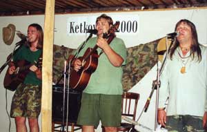 Poté zahráli TEMPLÁŘI z Moravského Krumlova, jenž spustili pohodový folk. Překvapilo mne obsazení kontrabasu - zpívající hudebnice Jitka Švédová. Následující brněnský DUFFY spustil něco mezi bigbeatem, folkem a country. Vynikl hlasový duet Pavla Buchty a Evy Lešíkové. Poté nastala sprcha evergreenů v anglickém i českém jazyce v dokonalém podání CLASIC BOURBON SEXTETu z Brna vystřídaná dalšími evergreeny opět brněnského T. E. BANDu. Zatímco první kapela zahrála takový pop + bigbeat, T. E. BANDi spustili líbivý trampský swing. Nechyběly ani Ryvolovky, např. "Poslední mindrák", "Heny" a "Šťastnej tulák". Končili posledním přídavkem od Joe Jégra "Ještě pár dnů". Byl to prostě pravý večerní hudební "nářez". Trampské písni věrná zůstala i FALEŠNÁ KARTA z Nového Města na Moravě. Nejvíce se mi líbily songy "Dopis na vojnu", "Sebevrah" a "Boxer" od Simona s Garfunkelem. Výjimkou z trampské dramaturgie večera (noci) byly brněnské folkrockové RYBY, které přijely bez bicích. Nehrály špatně, leč jsem se těšil na zlatý hřebík do rakve večera - KAPITÁNA KIDA z New Libouchec City. Ten byl pro mne vedle T. E. BANDu a nedorazivšího F. T. Primu lákadlem letošních Ketkovic. Zazněly nejen jeho největší hity, ale i staré trampské prvorepublikové šlágry a písně od jeho oblíbeného Gézy Včeličky (např. "Hoj trampové, piráti"). Jako vždy špikoval jednotlivé kousky mluveným slovem. Byl prostě super, ale hrál dost krátce. Po jeho vystoupení se konal krátký countrybál s kapelou FLÁM a velký sejšn po celém ketkovickém fotbaláku.
