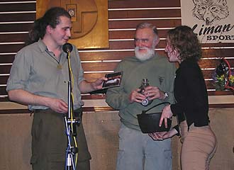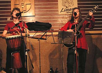 Blíží se osmá hodina a prostory Hifi klubu se zaplňují diváky, kamarády a akcionáři, kteří jsou zvědaví, jak to dneska všechno dopadne. U vchodu dostal každý se zakoupením "vlezenky" perníček ve tvaru lístku, čímž chtěla zřejmě kapela ukázat, že bude lehce stravitelná:-). První se na pódiu objevují "lesní panny" - Romana Tomášková a Mirka Králová ze skupiny Toman a lesní panna (kapelníka Pavla Tomana tentokrát nechali ležet doma v posteli). Hned v první písni Hříšná bylo vidět a hlavně slyšet, že holky dokážou skvěle hrát a zpívat i bez chybějícího kapelníka. Další písní byla Pověst z Kašperských hor následována Baladou se zhudebněným textem od Jana Nerudy. Udiveně jsem se díval na Romanu, jak hraje v písních současně na flétnu a ještě bubnuje. Kdybych to neviděl na vlastní oči, tak bych tomu snad ani nevěřil. Ale tím výčet nástrojů, na které ten večer Romana zahrála, zdaleka nekončí. Nesmím zapomenou na skvělou basu, exotickou šalmaj a na kytaru, na kterou v některých písničkách hrála místo Pavla. Na závěr holky "vyzkoušely" na posluchačích dvě nové písničky - Foggy Dew, kterou zazpívaly s českým textem od Romany a Metronom, u které vzbudil zasloužený smích poupravený verš: Tiše ťuká metronom a do něj zpívá déšť, loukou běhá agronom a honí divou zvěř. Následoval ještě jeden přídavek a pak holky bohužel musely přenechat pódium druhé kapele.