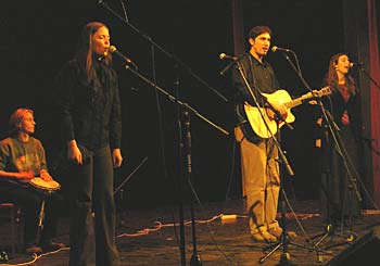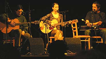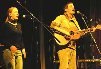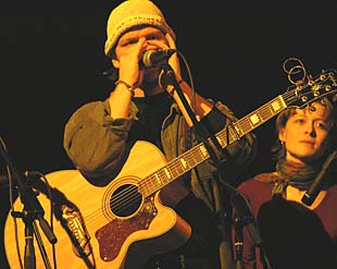 Narození nového iFOLKu na InternetFOLKjam přišlo oslavit několik kapel a sdružení, jejichž webové stránky hostují na IF, a zpočátku také několik platících diváků, několik pacientů léčebny Bohnice a několik redaktorů FT. Jakmile přestala hrozit přesilovka jeviště - hlediště, mohla besídka začít. Moderátoři slavnosti, mladí a krásní Jeroným Lešner a Miloš Keller, zvolili jednotné oblečení, bleděmodré košile, tmavomodré vesty a černé džíny (na džínách puky nevyžaduji) a kultivovaně zasvěceným a chvílemi i vtipným slovem provázeli celým programem. Ti, kteří očekávali vzájemné břitké jiskření známých netových diskutérů, sice překvapeně sledovali, jak byli krotcí, ale oni si to na netu vynahradí. Kdo z nich byl lepší, je nasnadě, samozřejmě ten mladší a krásnější, protože je na rozdíl od toho druhého redaktorem FT :-))) První kapela, která si přijela strašlivě zajamovat až zez Plzni, jak říká Miloš Keller (z Plzně, jak říkají Plzeňáci), byla Strašlivá Podívaná a předvedla folk historizující i čerpající z různých žánrů (blues, etnická hudba, lidová písnička). Pány upoutávaly zejména tři dámy a naopak, všechny pak jejich muzika, v níž dominuje zpěv Ivy Valečkové a Petra Merxbauera a zlobivý hoboj Ivy Novákové. Takový konec, bych si přál zazpívali a diváci je bez přídavku nenechali odejít. Pražští Bezefšeho se před koncertem v zimní zahradě pečlivě rozezpívávali, na scéně v