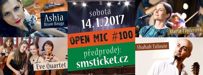 Ashia Bison Rouge, Eve Quartet, Marta Töpferová, Shahab Tolouie, Krystyna Skalická & Libor Heřman, Lukáš Sommer a Tapa-de-deux, Adéla & Matyáš Poštulkovi, Elmira a Jan Řepka. Jedna z nejznámějších pražských otevřených hudebních scén se 14. ledna dočká svého stého pokračování. Během 99 večerů se na ní představilo téměř 600 různých autorů. Mezi hosty pořadu byla řada vynikajících písničkářů z celého světa, koncepce pořadu inspirovala mnohé další a vedla nepřímo i přímo k založení několika dalších openmiců po celém území Česka a Slovenska. Jan Řepka dodává: "Když jsem Open Mic spolu s Michalem Bystrovem v roce 2007 zakládal, rok 2017 byl pro mě nepředstavitelně vzdálenou budoucností. A vida. Je tu. Přijďte tohle jubileum oslavit s námi. Bude mi nejen potěšením a ctí, ale také dokladem toho, že má smysl dále pokračovat."