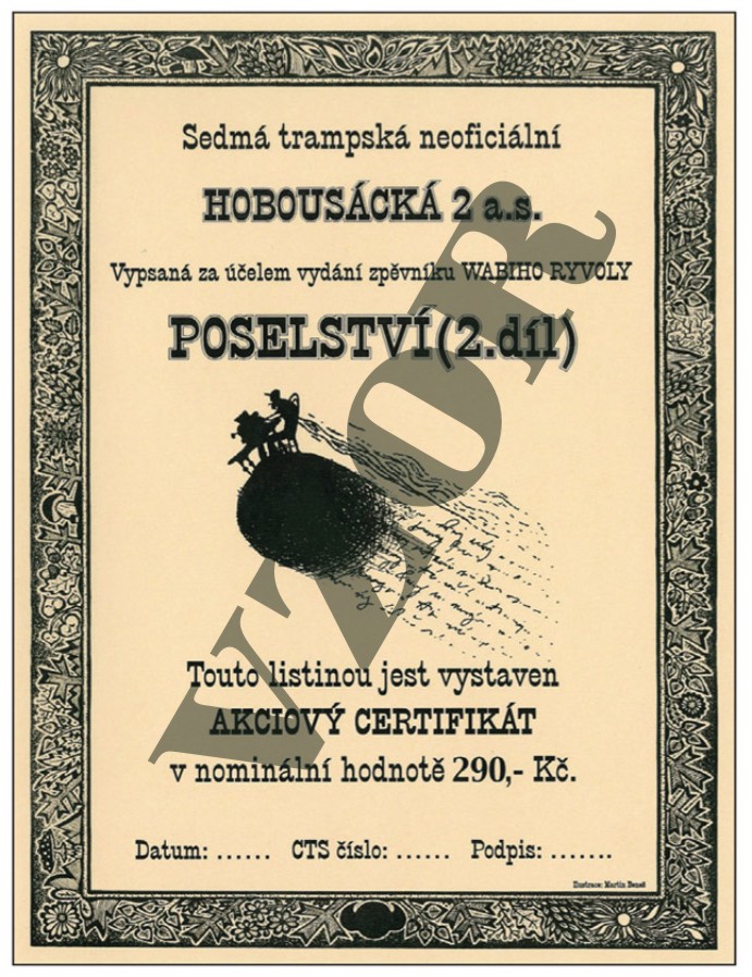 Nyní se vyhlašuje další akciovka - Hobousácká 2, která nabízí vzácné obligace (viz obrázek) na netrpělivě očekávaný druhý díl Wabiho zpěvníku, jehož vydání je plánováno na březen příštího roku. Jinými slovy - opět jde o to, aby se sehnal dostatek peněz k vydání, tak jako minule a mohlo se uzavřít ojedinělé knižní dílo na poli trampské písničky. Druhý díl zpěvníku bude mít okolo 390 stran, barevnou obálku s pevnou vazbu, aby se při nošení neponičil a najdeš v něm: - 154 písní (od roku 1975) z nichž 116 jich bude v notách i s akordy a 38 písní jen s textem, protože se nedochovala žádná nahrávka, ani notový záznam. - dohromady i s prvním dílem půjde o 277 písní na 690 stranách! - velké množství archivních fotografií - povídání k písním (krátké příběhy o jejich vzniku, či z jejich dalšího písničkového života) Podobně jako u dílu prvního se i zde v notách objeví úplně neznámé nebo málo známé písně: Až mi dojdou noty na hvízdání, Kytary do naha, Zimní hospoda, Modrý stín (Black Orpheus), Ghetto, Obyčejný kluci. Ale zapomenutých či znovuobjevených písní, opatřených notovým zápisem, bude ve zpěvníku pochopitelně mnohem víc. Druhý díl opět zpracovává Petr Růžička – Růža a zpěvník přislíbili obohatit svými příspěvky například Miki Ryvola, Alan Ryvola, Saša Ryvolová, Sava Klimeš – Slim, Béďa Šedifka, Fredy Schubert, Tony Linhart, Hanka Hosnedlová, Pavel Lohonka - Žalman a další. Koupí akcie získáš nárok na: - jeden výtisk zpěvníku, který ti po vydání bude předán, či poslán poštou - jmenovité poděkování uvnitř zpěvníku - akciový certifikát Objednávky akcií: Mailem na Tato emailová adresa je chráněna před spamboty, abyste ji viděli, povolte JavaScript Co nejrychleji ti bude poslána akcie i s přiloženým číslem účtu a složenkou typu C, druh platby - který ti bude vyhovovat víc - bude na tobě. Cena jedné akcie je 290 Kč a bude k ní připočteno i poštovné 10 Kč, víc ani ťuk. V průběhu roku budeš informován buď mailem, nebo zde na FOLKtime.cz o tom, jak dílo pokračuje a v samotném finále ti dojde mail se seznamem koncertů, kde ti bude zpěvník předán. A pokud si ho nebudeš moci přijít vyzvednout, tak poslán. Sdílet na... Kam dál? » Vychází zpěvník Poselství Wabiho Ryvoly (Michael Antony - Tony)» Bleskovka o Hobousárny (FOLKtime.cz)» Draze placená Pocta trampské písni (Belmondo)» Soutěž o zpěvník Wabiho Ryvoly - Poselství 1. díl (FOLKtime.cz)