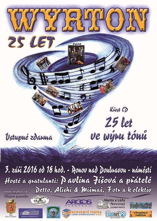 Co si řeknete o někom, komu je 25 let? Asi že je mladý, vitální, perspektivní, v rozpuku, apod. A co si řeknete v případě, že slaví čtvrtstoletí kapela? Budete se divit, že ještě existuje, nebo si budete myslet, že už patří do starého železa. Vězte, že tomu tak být nemusí. Bluegrassová skupina Wyrton z Ronova nad Doubravou má všechny atributy pětadvacetiletého mladíka, z kterého entuziasmus přímo čiší a umí nakazit celé okolí skvělou náladou. Nevěříte? Přijďte se přesvědčit v sobotu 3. září 2016 od 18 hodin na náměstí do Ronova nad Doubravou a sami uvidíte (a uslyšíte), že je to pravda. Co se bude dít? Kromě bujarých oslav kapely se bude křtít nové CD s názvem 25 let ve wýru tónů. V roli kmotry se představí osoba z nejpovolanějších, a to první dáma folku Pavlína Jíšová, která poté s Wyrtonem zazpívá několik písní a pak se představí se svou úžasnou kapelou. Kromě ní přijde ještě řada dalších gratulantů v podobě skupin Detto, Alishi & Mišmaš a Fotr a kolektiv.